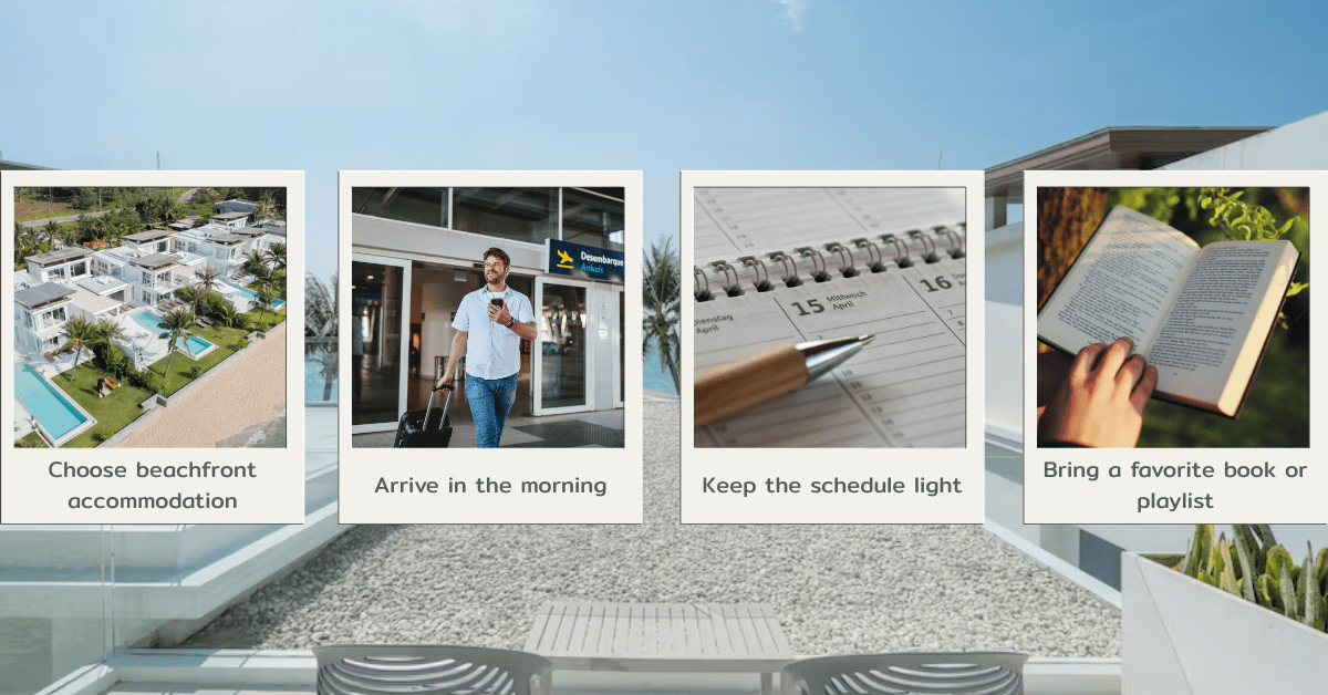 Daytime rest — no packed itinerary needed. The whole point is genuine rest: reading by the pool, swimming, walking the beach, or taking photographs. The trip doesn’t need to be busy to be worthwhile.