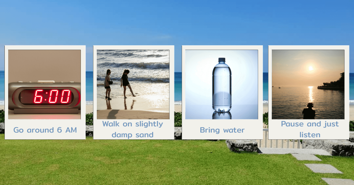 The best window is roughly 6:00–7:30 AM — the sand is still warm from the morning air, crowds are minimal, and the only sounds are waves and wind.